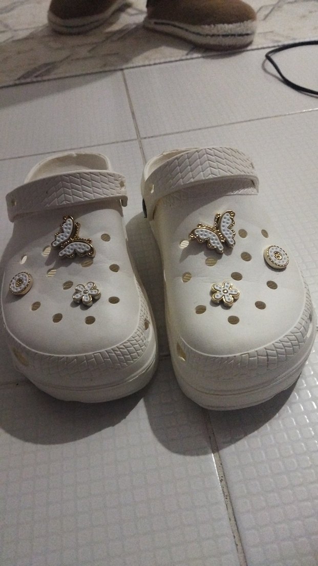 Beyaz kauçuk kadın terlikler, dolgu topuklu, tokalı kayışlı ve nakışlı kelebek ile çiçek desenlerine sahip. Bohem tarzda sokak giyimine uygun.