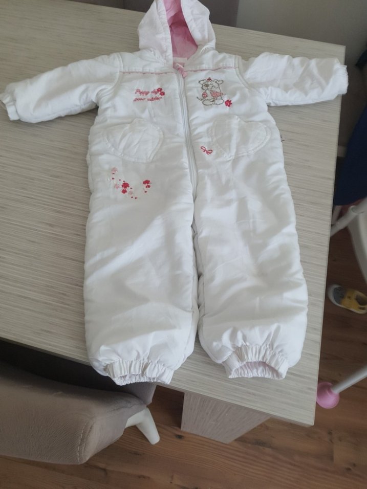 Nakışlı, kapüşonlu beyaz bebek tulumu, ön fermuarlı ve pastel renk detaylıdır. Yumuşak ve sıcak kumaştan üretilmiştir. ❄️