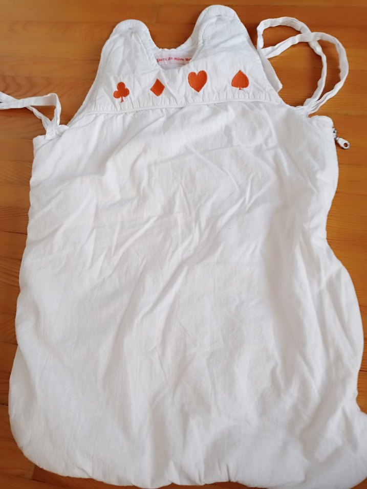 Beyaz keten kumaştan, üzeri kart sembolleri nakışlı bebek uyku tulumu. Bağlama ipleriyle güvenli ve rahat uyku sağlar.
