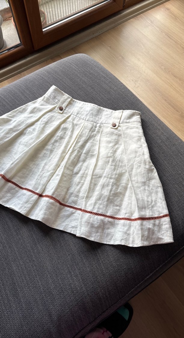 Beyaz keten midi etek, pilili ve nakışlı detaylara sahip. Minimalist bohem tarzı yansıtan, rahat kesim günlük kullanıma uygun bir model. Etek boyu 45 cm ,astarı var