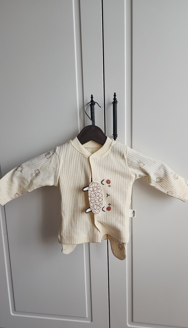 Çıtçıtlı, yuvarlak yakalı ve uzun kollu alt üst takım. Krem renkte %100 organik. Hiç kullanılmadı. 6 ay/68 cm