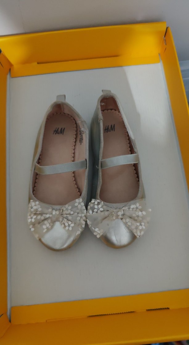 Beyaz nakışlı ve önünde fiyonk detaylı kız babet ayakkabılar. Yumuşak kauçuk tabanlı, bohem tarzda klasik şıklık sunar. Marka: H&M.