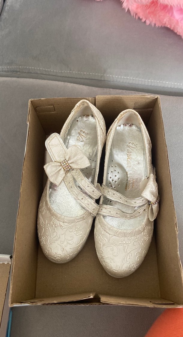 Nakışlı desenleri ve fiyonk detaylı beyaz kız babet ayakkabılar, kauçuk malzemeden, klasik ve hafif tarzda.