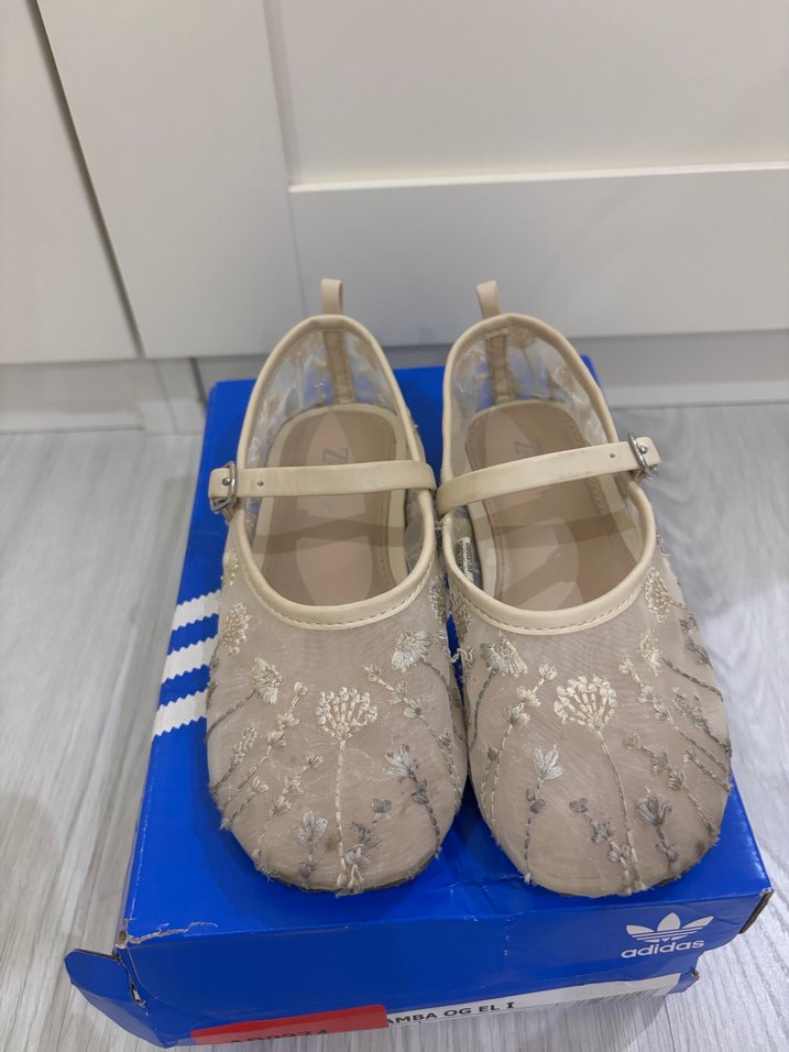 Nakışlı dantel detaylı, beyaz renk kız babet ayakkabı. Konvansiyonel tarzda, kauçuk tabanlı ve hafif tasarım. 16,3 cm