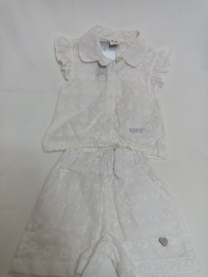 Beyaz dantel ve pastel nakışlı desenlere sahip kısa kollu kız bebek takımı. Üst ve şorttan oluşur, zarif bir görünüm sunar.