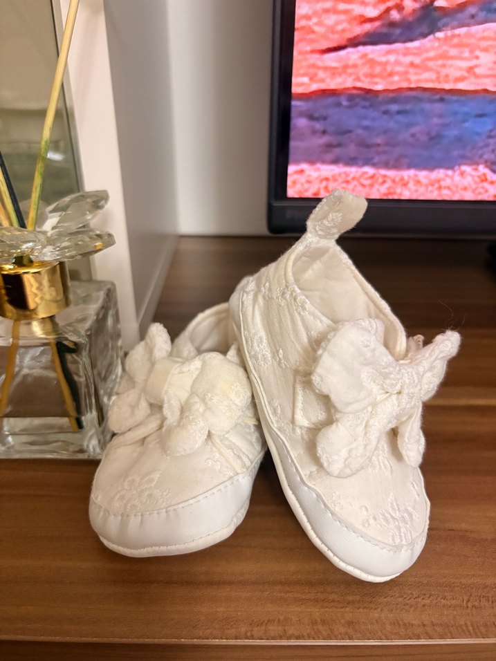 Dantel detaylı, yumuşak kauçuk malzemeden yapılmış beyaz nakışlı bebek ilk adım ayakkabısı, klasik ve zarif bir tarz sunar.