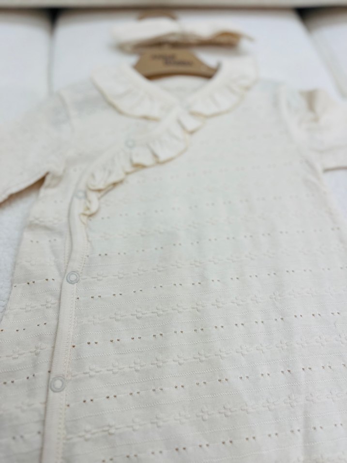 Beyaz, kısa kollu kız bebek body, nakış desenli ve düğmeli. Yumuşak pastel tonlarda, fırfırlı detaylı. 100 pamuk beden sorunuz