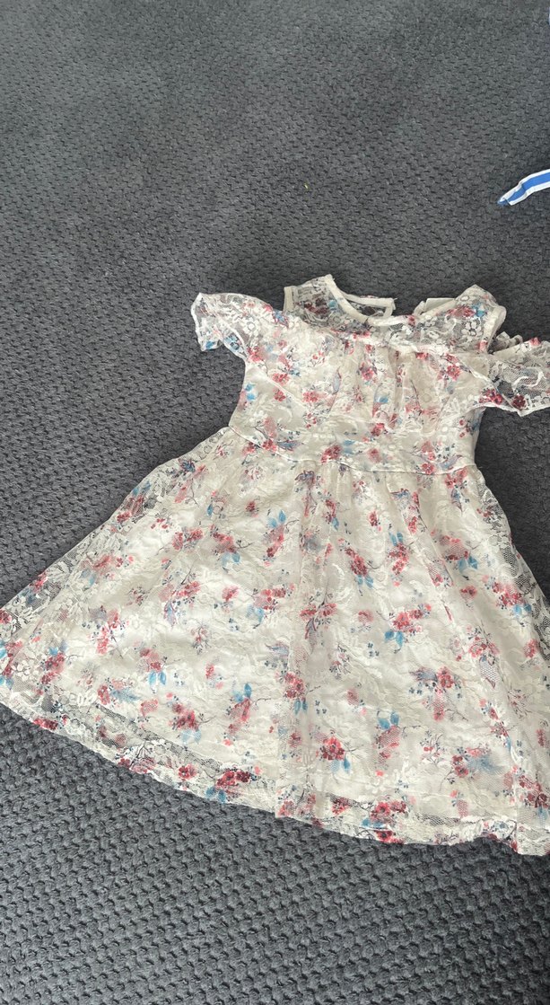 Beyaz, nakışlı çiçek desenli kız çocuk elbisesi. Dantelli, kısa kollu, straplez ve bol kesim bohem tarzda.