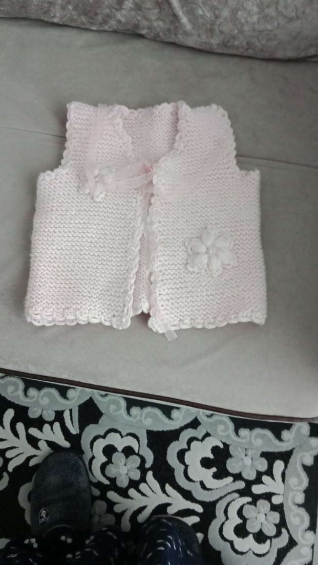 El yapımı kız çocuk yeleği çiçek detaylarıyla süslenmiş, açık pembe renkli kız çocuk kolsuz yelek.