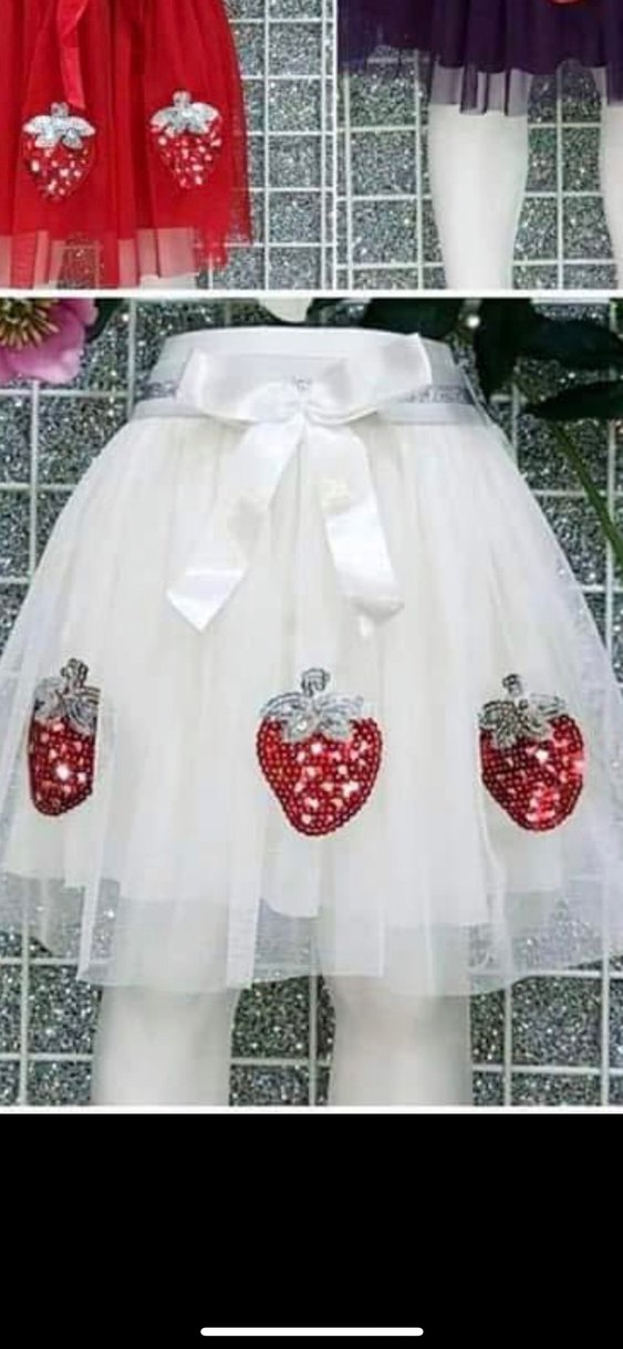 Nakışlı çilek desenli beyaz kız çocuk eteği, fırfırlı ve saten kemer detaylıdır. Sentetik kumaştan, bol kesimdir.