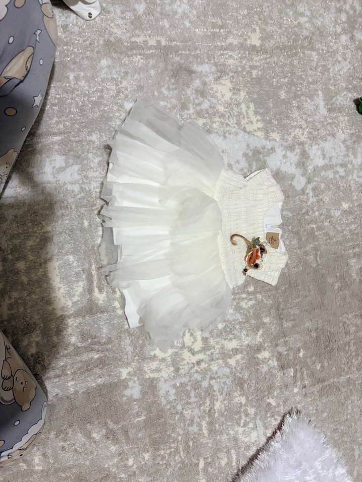 Straplez kollu, nakışlı ve fırfırlı etekli beyaz kız çocuk elbisesi. Kapüşonlu yaka ve dar kesim örme kumaş kullanılmıştır.