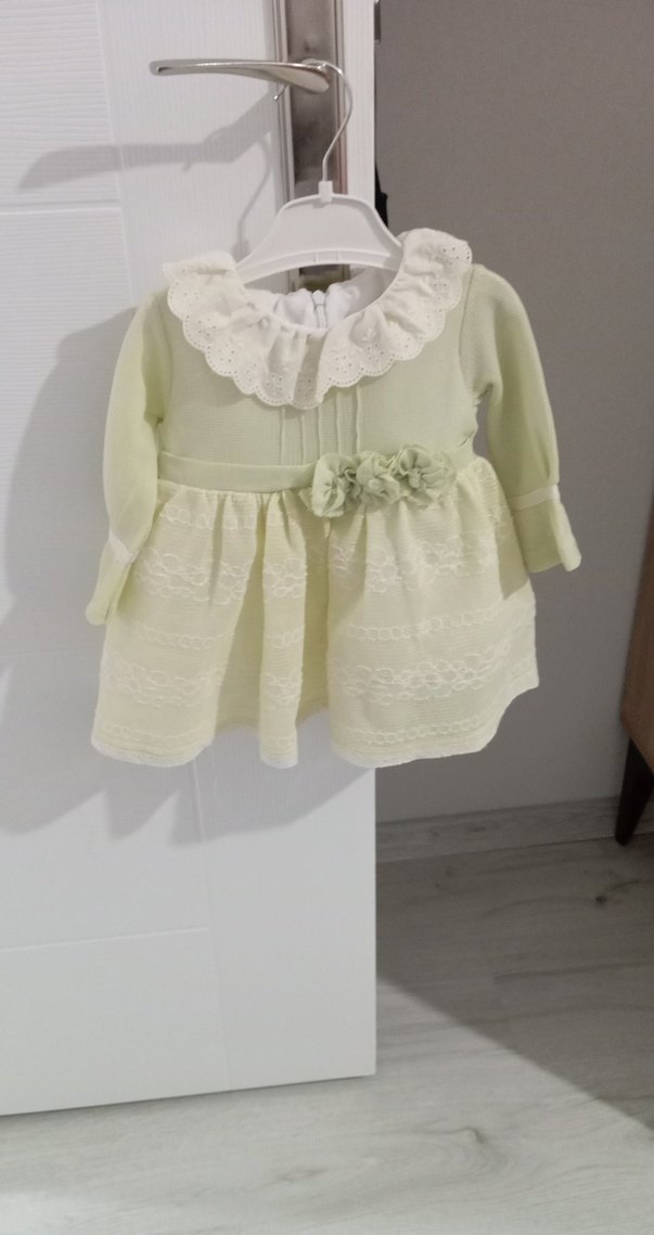 Uzun kollu, yuvarlak yakalı kız çocuk elbisesi, fırfır detaylıdır. Yumuşak ve sıcak kumaştan, nakışlı ve bol kesimdir. Pastel beyaz renkte, modern klasik tarzda.