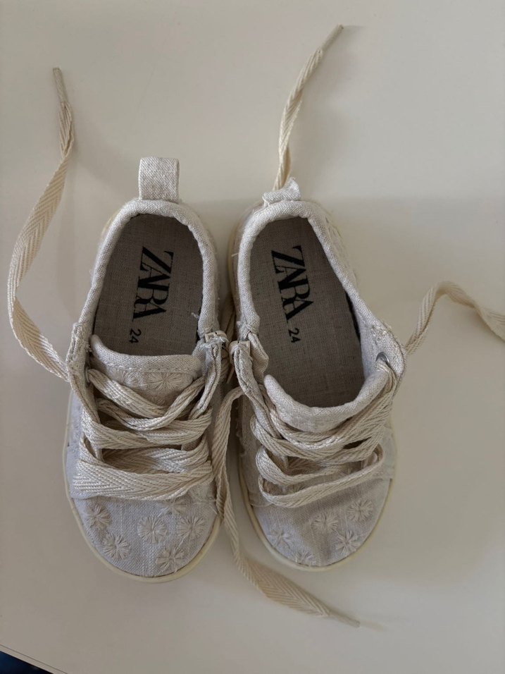 Nakışlı desenli, bağcıklı beyaz keten kız çocuk spor ayakkabısı. ZARA markasına ait bohem tarzda yumuşak ve doğal görünümlü model.