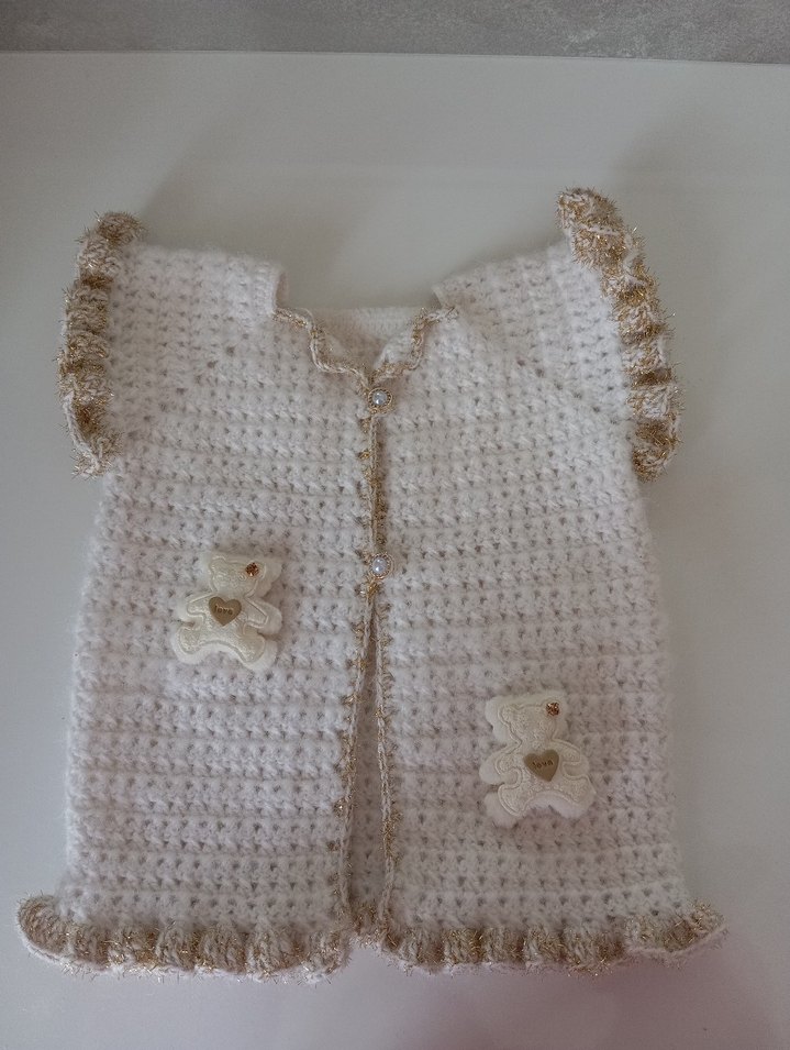 Nakışlı detaylar ve süslü ceplerle beyaz, kolsuz, bol kesim triko yelek. Bohem tarzda kız çocukları için uygun. 9 12 aylık kız bebek için uygundur. Fırfır detaylarıyla da ayrıca çok güzel bir örgü yelektir.
