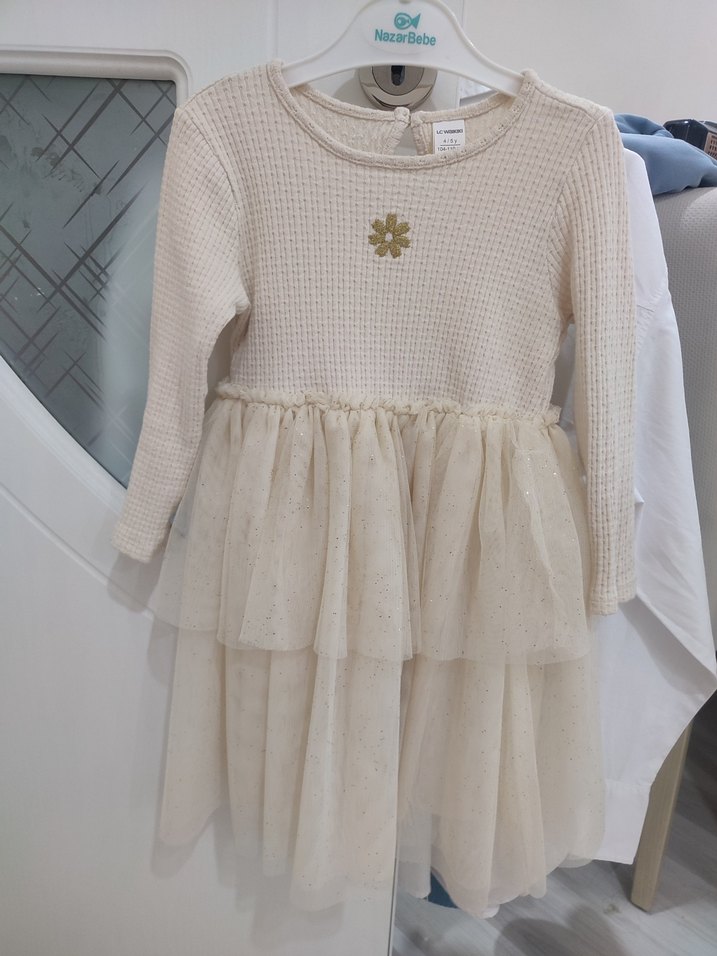 Beyaz renkli, uzun kollu, yuvarlak yakalı kız çocuk elbisesi. Triko üst kısmı nakışlı, kat kat tül etek kısmı yumuşak dokulu ve bol kesimdir. Klasik şıklık sunar.