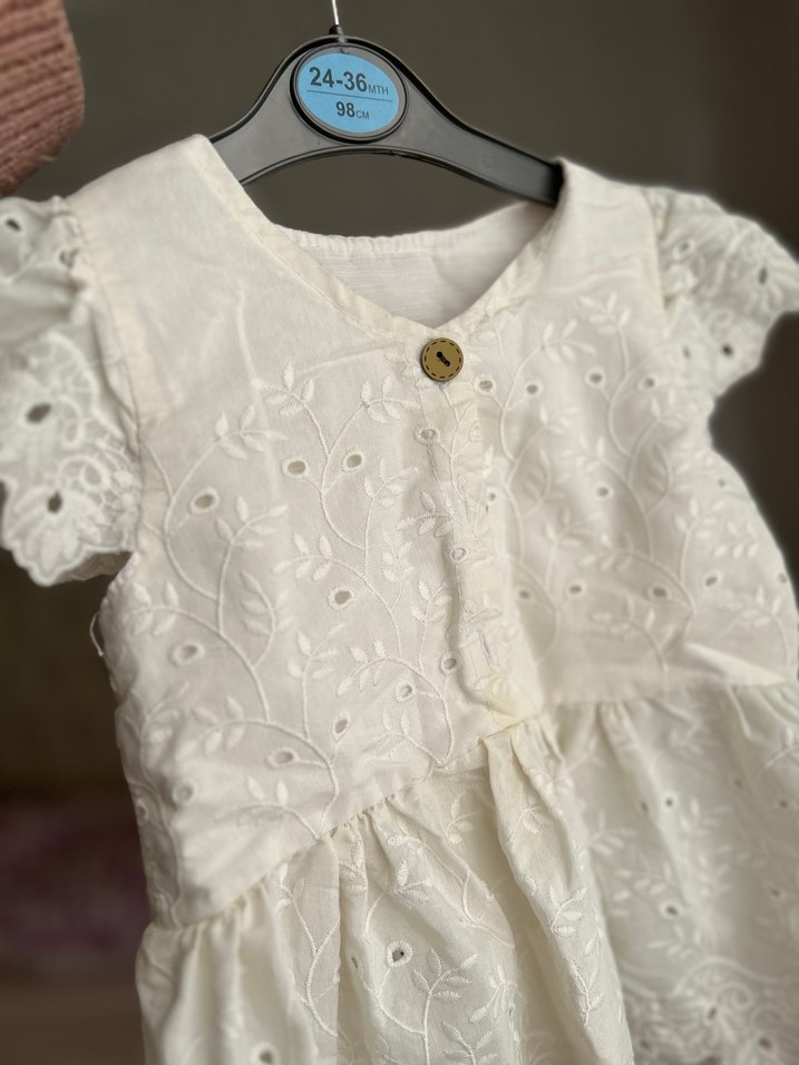 Beyaz renkli kız elbisesi, kısa kollu ve biisklet yakalıdır. Pamuk kumaştan üretilmiş, nakışlı desenlere ve düğmeli detaylara sahiptir. Rahat bol kesimdir. 6-7 yaş yazıyor fakat 4-5 yaşa daha uyumlu