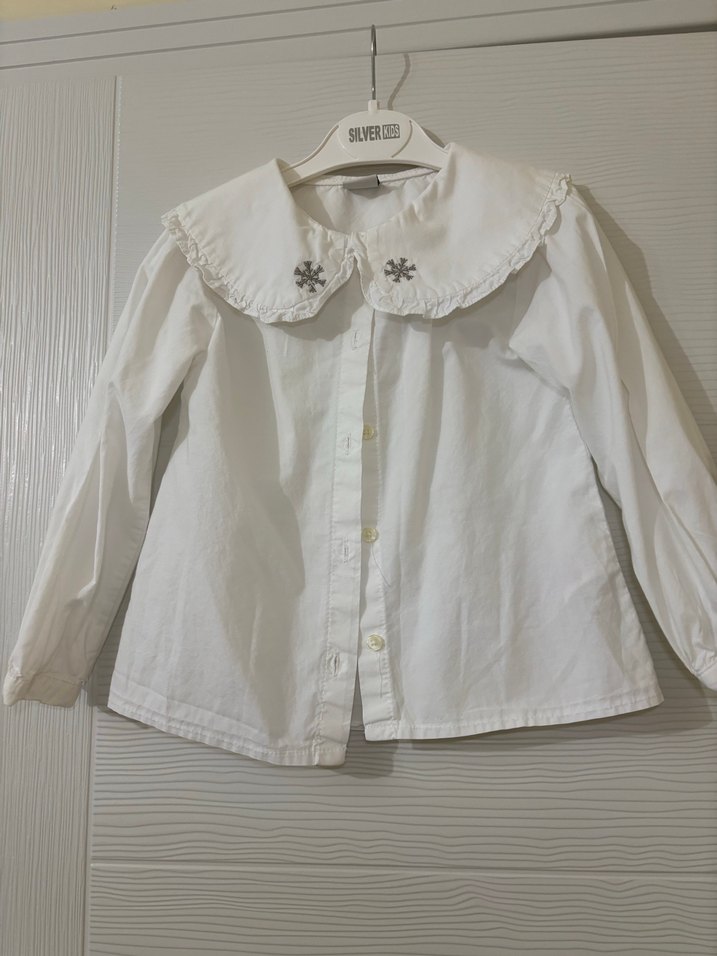 Beyaz, nakış detaylı kız gömleği. Düğmeli, yakalı ve uzun kollu, rahat kesimli keten kumaştan yapılmıştır. ✨