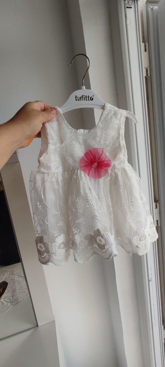 Nakışlı ve fırfırlı, kolsuz, straplez yaka kız elbisesi. Bol kesim, açık renk ve bohem tarzda. Üzerinde pembe çiçek detay bulunuyor. kızıma hediye geldi olmuyor o yüzden satıyorum