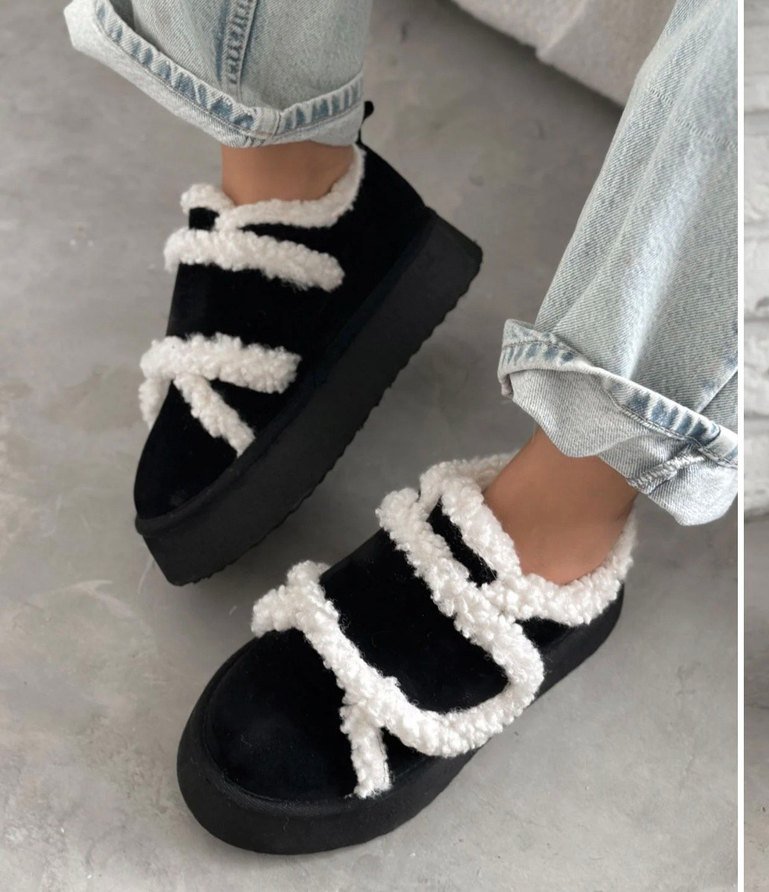 Kadınlar için platform topuklu, beyaz kürk işlemeli detaylara sahip botlar. Yumuşak polar kumaştan üretilmiş, sokak stili ve günlük kullanım için uygundur.