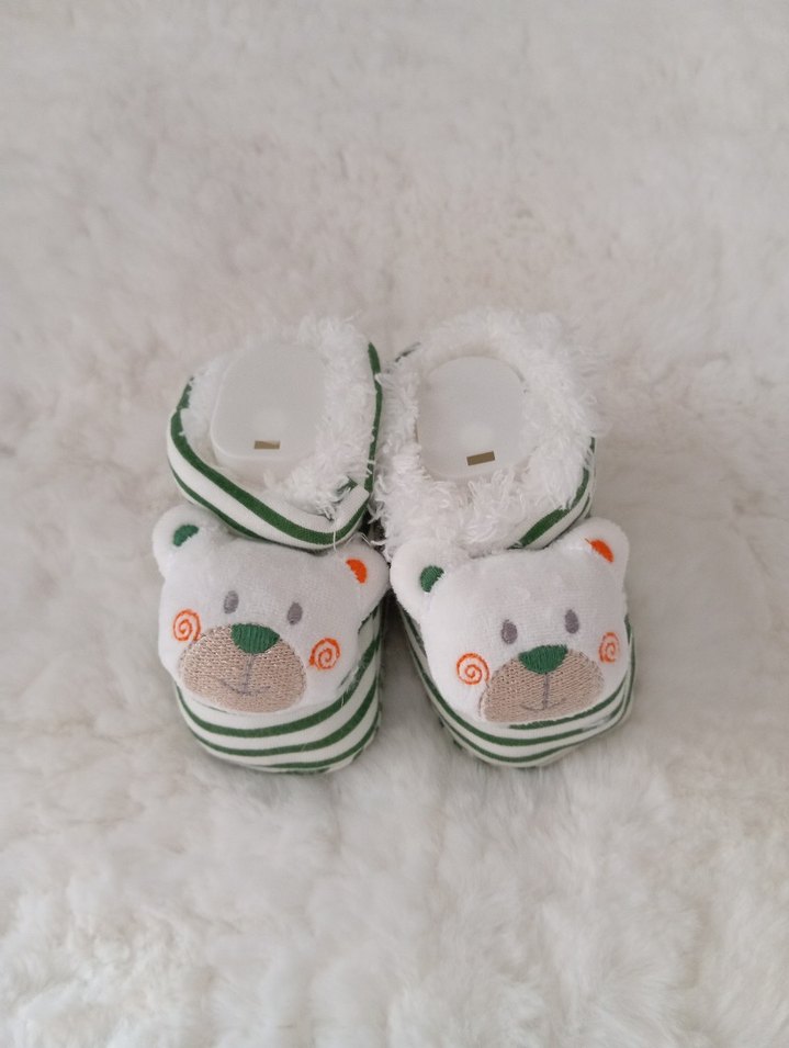 Beyaz nakışlı ayıcık desenli ve kürklü detaylı bebek patiği, sıcak ve şık bir sokak giyimi tarzı sunar.