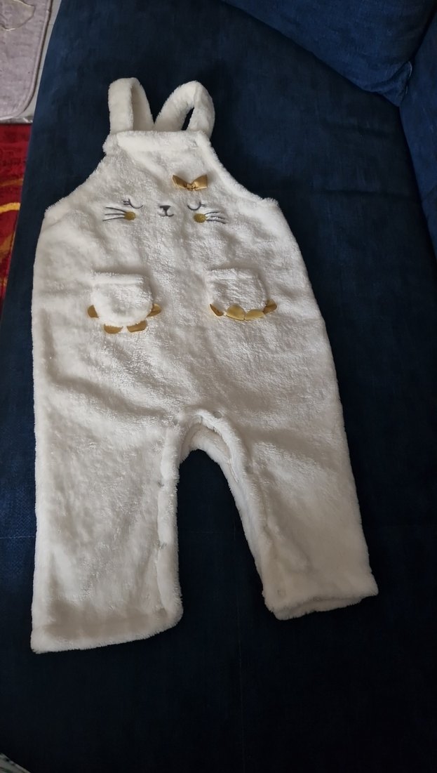 Parlak beyaz renkte, nakış desenli ve kürk detaylı kedi tulumu. Sokak modası tarzında, sevimli cepleri ve yumuşak dokusu vardır. bebeğime hediye ancak bedeni küçük geldi giyemedi sorunsuz