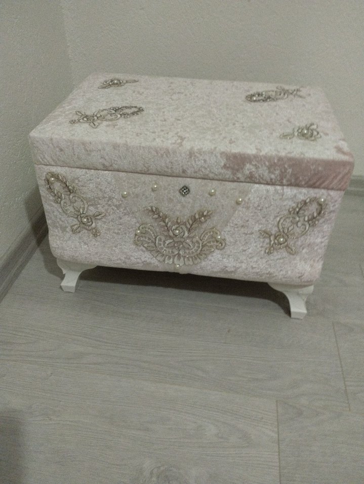 Nakışlı ve küçük incilerle süslenmiş beyaz makyaj organizer kutusu, küçük ayaklar üzerinde duruyor. Makyaj malzemelerini düzenlemek için uygun. hiç kullanılmamış çeyiz kutusu