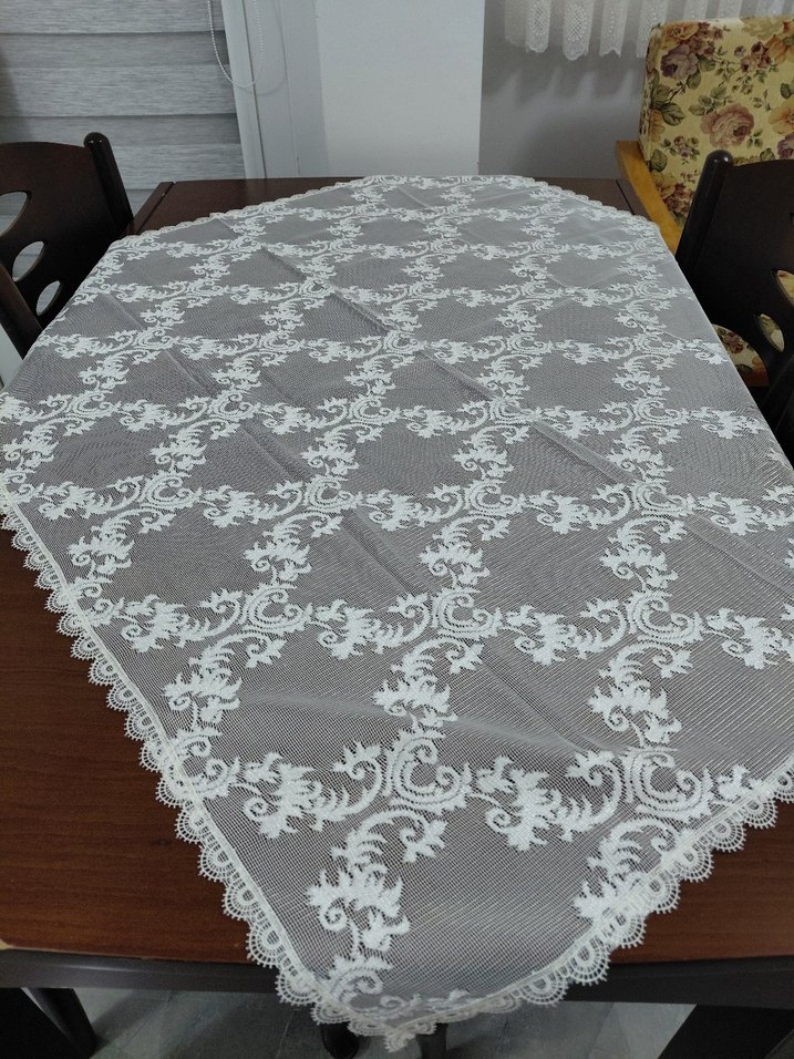 Beyaz nakışlı ve dantel kenarlı geleneksel tarzda masa örtüsü. Masanıza zarif bir dokunuş katar.