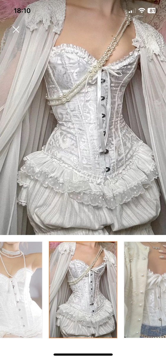 Nakışlı detaylara sahip, normal midi boyda, beyaz ve vücuda oturan büstiyer. Ön kısmında kanca kapanış ve ince fırfır süslemeler bulunur. Güncel fiyatı 2250