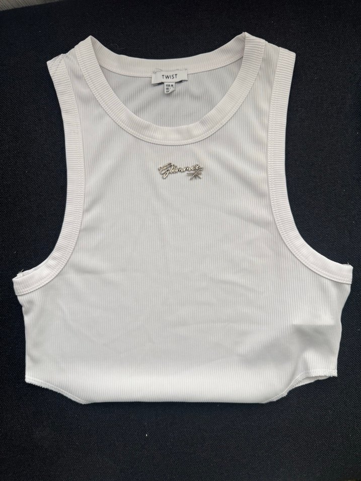 Beyaz, nakışlı, kısa kesim ve kolsuz bu atlet, sentetik kumaştan üretilmiş ve parlak bir görünüm sunar.
