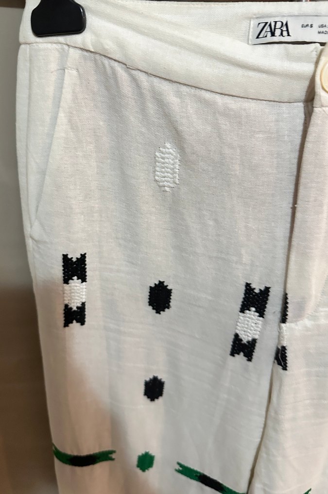 ZARA markalı, düğmeli, nakış detaylı beyaz mini kumaş pantolon, bol kesim ve minimalist bohem tarzda.