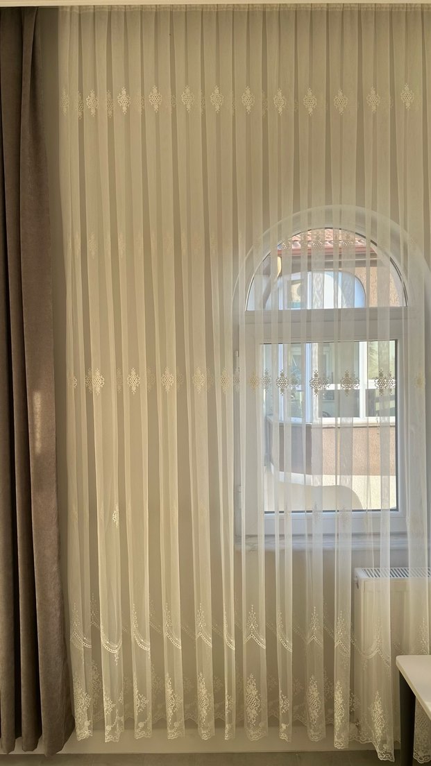 3 mt ve 3 mt 2 adet toplam 6 mt tül perde taçtan yaptırdım 2 adet gri renk fon perde çok temiz kullanıldı. Beyaz renkte, gri nakışlı modern klasik tarzda perde, pencerenize zarif ve şık bir görünüm sağlar.