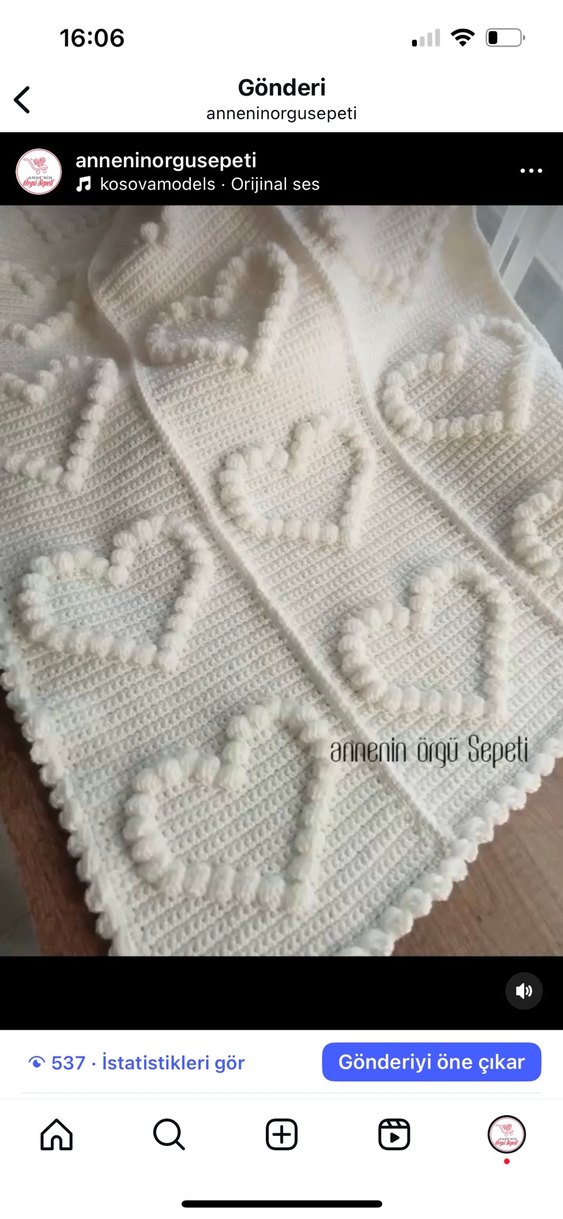 Nakışlı kalp desenleri ve yumuşak dokusu olan beyaz örgü bebek battaniyesi. Kenarları ponpon detaylıdır. Sipariş üzerine istenilen renk hazırlıyorum