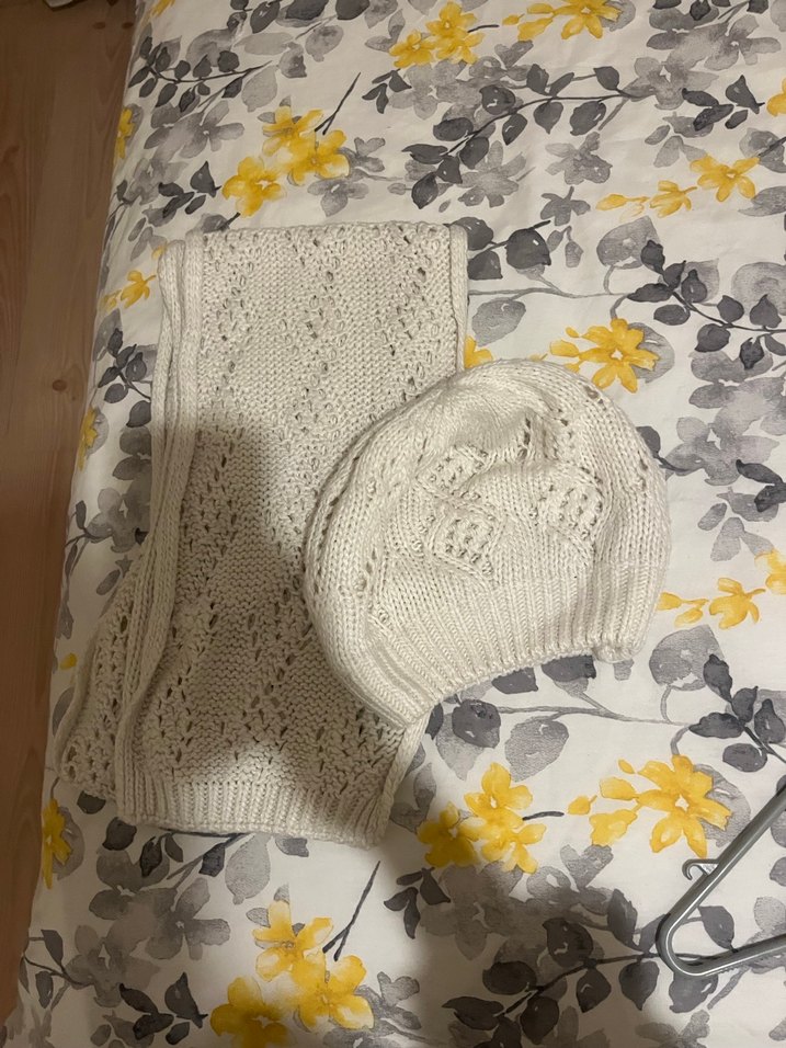 Beyaz nakışlı örgü bere ve atkı seti, bohem tarzda yumuşak ve rahat bir kullanım sunar.