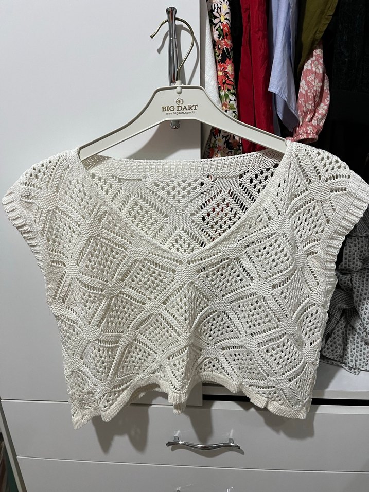 Beyaz renkli, kısa boylu, V yaka ve nakışlı örgü desene sahip bohem tarzda kadın kazak. Rahat kesim ve yumuşak örgü kumaştan üretilmiştir.