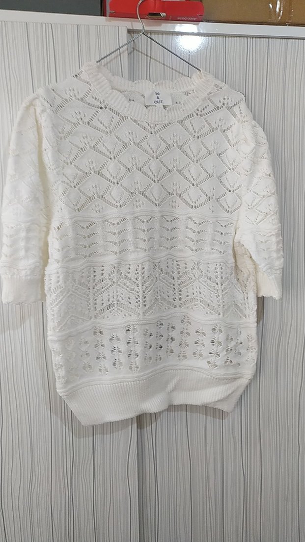 Nakışlı desenlere sahip, yuvarlak yakalı beyaz örgü kazak. kısa kollu bol kesim ve bohem tarzıyla rahat bir kullanım sunar. tiriko