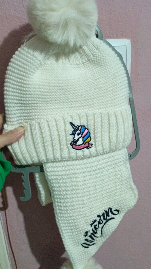 Nakışlı unicorn figürlü beyaz örgü çocuk bere ve atkı seti, trend sokak stili için uygun.