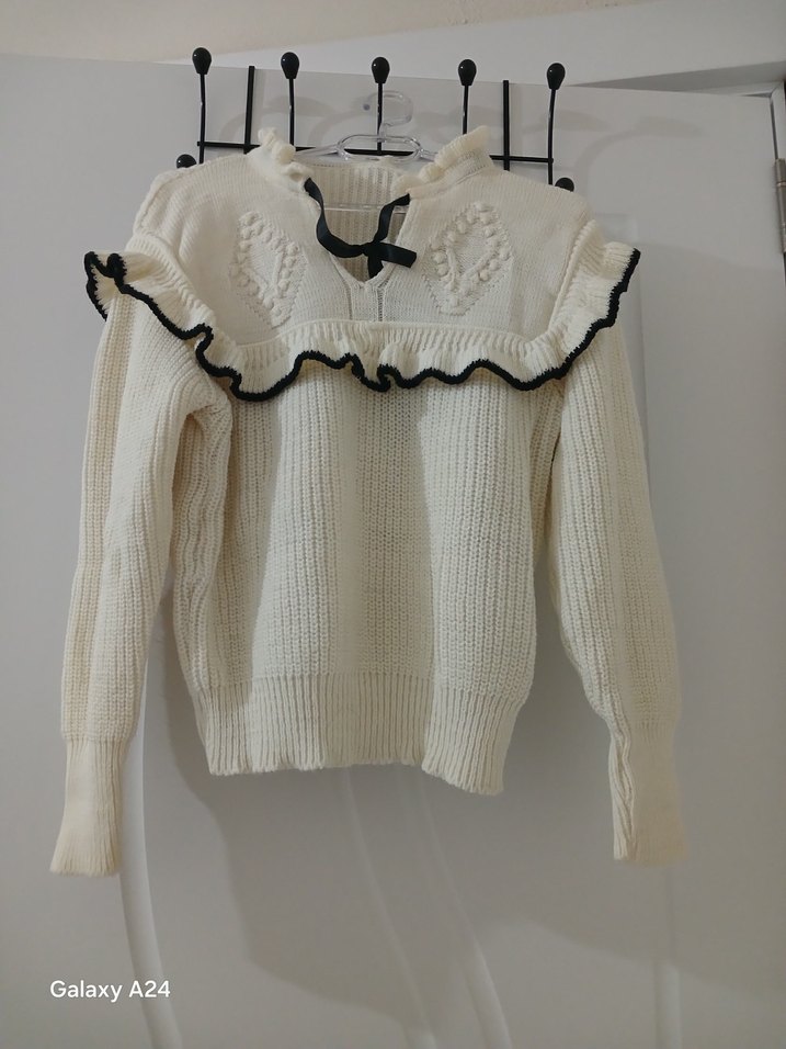 Beyaz örgü kazak, uzun kollu ve yakalıdır. Siyah şerit ve nakış detaylarıyla şık, günlük kullanıma uygun rahat bir modeldir.