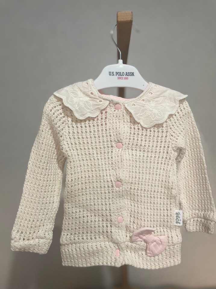 Krem renkli, uzun kollu, yuvarlak yaka örgü kız hırka. Nakış detayları ve pembe düğmeleriyle modern klasik tarzda, hiç kullanılmadı sadece yıkandı