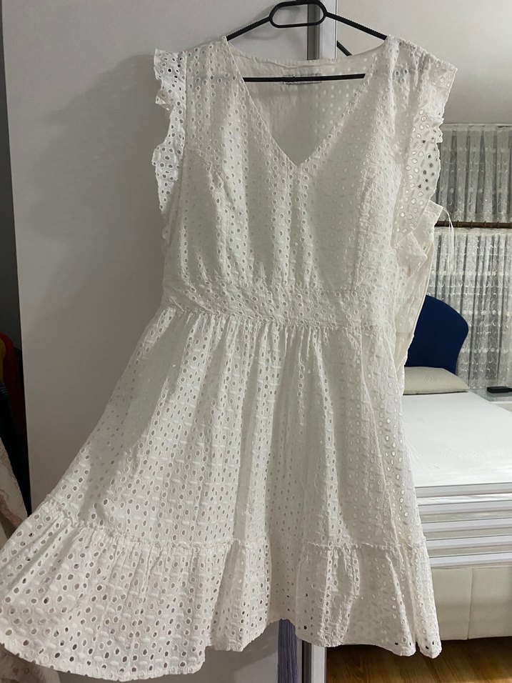 Beyaz pamuklu midi elbise, dantel detaylı ve nakış işlemeli. V yaka ve kolsuz, bol kesimli bohem tarzda, günlük kullanım için uygundur.