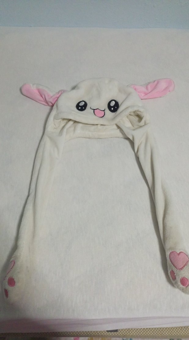 Beyaz, yumuşak peluş detaylı çocuk bere, nakışlı sevimli yüz ifadesi ve pastel pembe kulak detaylarıyla sıcak tutar.