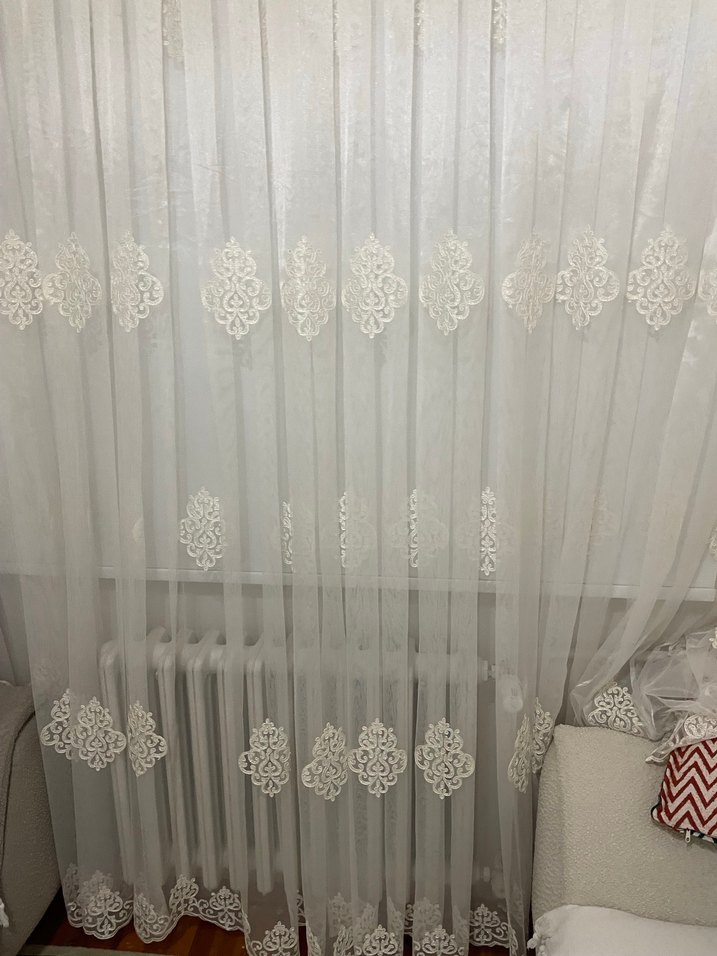 Geleneksel tarzda, gri tonlarda beyaz nakışlı perdeler. Odaya zarif bir dokunuş katıyor. Eni 2 metre 95