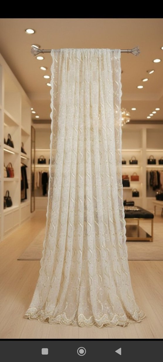 Hafif ve zarif dokunuşlar katan, nakışlı desenlere sahip beyaz, klasik tarzda perde. sayılı kullanıldı