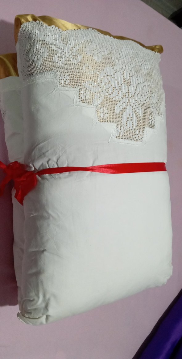 Kırmızı kurdeleyle bağlanmış, narin nakışlı beyaz ve saten parlak sarı yastık. Hafif ve şık tasarım, yatak odası için uygun. ️