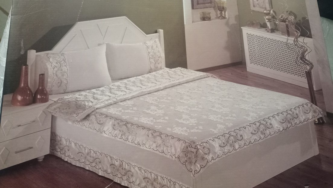 beyaz yatak örtüsü, yatak odasına zarif bir dokunuş katıyor. Kenarlarında ince işlemeler bulunur. ️