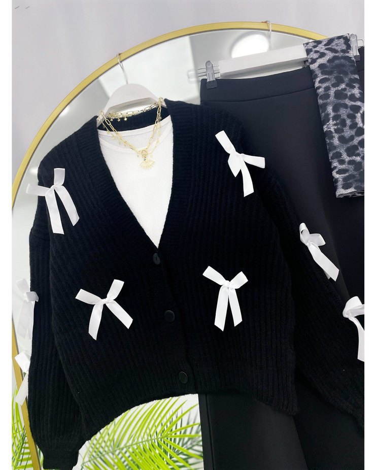 Beyaz Nakışlı Siyah Örgü Mini Hırka