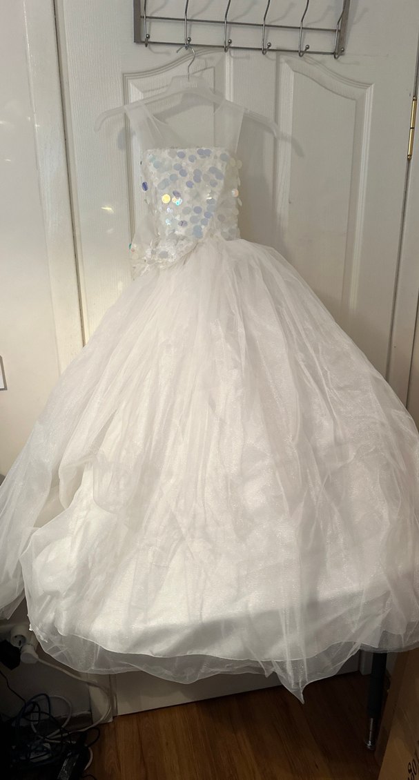 Nakışlı detaylara sahip, straplez ve kolsuz beyaz elbise, drapeli ve hacimli etek kısmıyla şık bir tasarıma sahiptir.