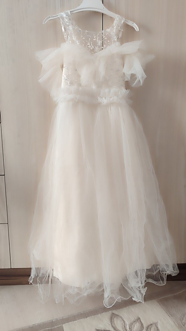 Nakış işlemeli, straplez ve kolsuz beyaz elbise, yumuşak sentetik kumaştan ve fırfır detaylıdır. Bohem tarzda ve vücuda oturan kesime sahiptir. 8 9 yaş grubuna uygundur.