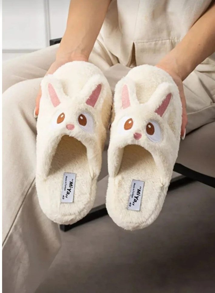 Nakışlı tavşan figürlü, beyaz renkli, yumuşak kürklü kadın ev terliği, rahat ve trend bir görünüme sahip. 36 40 numara arası mevcuttur