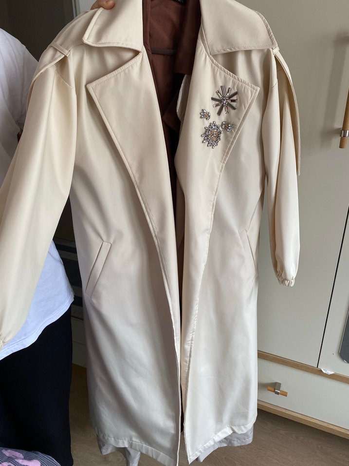 Beyaz renkli, nakış detaylı trençkot, düğmeli ve kesik yaka tasarıma sahiptir. Uzun kollu ve parlak görünüm sunar. S-M uyumlu