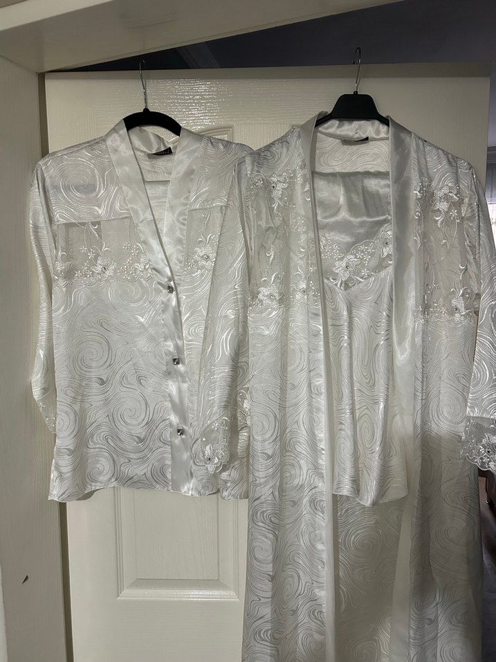 Nakışlı desenlere sahip parlak beyaz kumaştan, bol kesim ve uzun kollu vintage bohem tarzda uzun kadın sabahlık. Ürün 5 parçadan oluşuyor uzun kol ve uzun pijama askılı ve şort şeklinde birde uzun sabahlıgi var